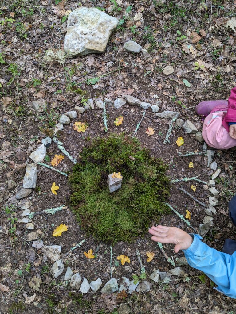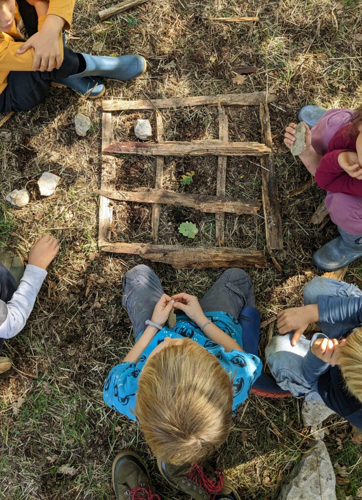La nature regorge d’une multitude de richesses permettant de compter, tracer, trier, classer, créer. Cette découverte du milieu naturel offre aux enfants l’opportunité d’affuter leurs observations, de créer des liens, une connexion et du sens entre leurs connaissances. Ces expériences de vie dans la nature permettent de s’ancrer, de s’enraciner et de se construire avec des fondations durables et solides. Cette ouverture permet la libre circulation des connaissances, la coopération et la construction commune d’un monde riche et porteur pour les enfants qui sont les adultes de demain.