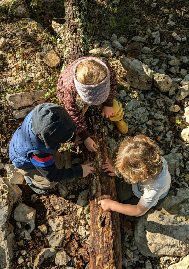 Il nous paraît essentiel qu’ils puissent avoir des temps d’imprégnation en nature, sans objectifs pédagogiques ou volonté d’apprentissage. En effet, l’observation, l’éveil des sens, la connexion qui se crée, lorsque les enfants peuvent découvrir librement la nature, est un terreau fertile offrant une meilleure connaissance d’eux-même, de l’environnement et des autres. C’est un cadeau précieux que l’enfant gardera en lui tout au long de sa vie.